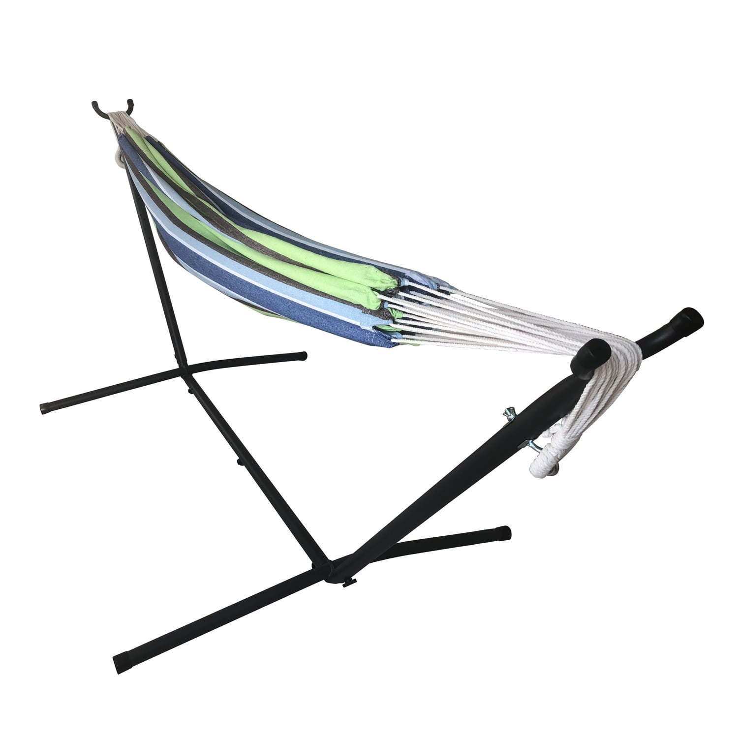 The sturdy hammock allows for optimum comfort and support when you are trying to take it easy in the backyard or on the porch. The stand is super durable and allows for gentle swaying of the hammock so you can spend more of your time relaxing. This double hammock swing and space-saving stand can be quickly set up and is easy to relocate. It has adjustable height options so you can choose your perfect position. The main body of hammock is polyester cotton, comfortable and breathable. High density fabric is soft and durable. The metal knot can prevent the long-term friction and prolong the service life of the hammock. The ropes tightly braided and fixed, which greatly increases the load bearing coefficient, even tension. It comes with two portable & easy to store carrying bags for easy travel. The Blue Striped Hammock with Metal Stand can comfortably supports 2 adults and holds up to 450Lbs.
