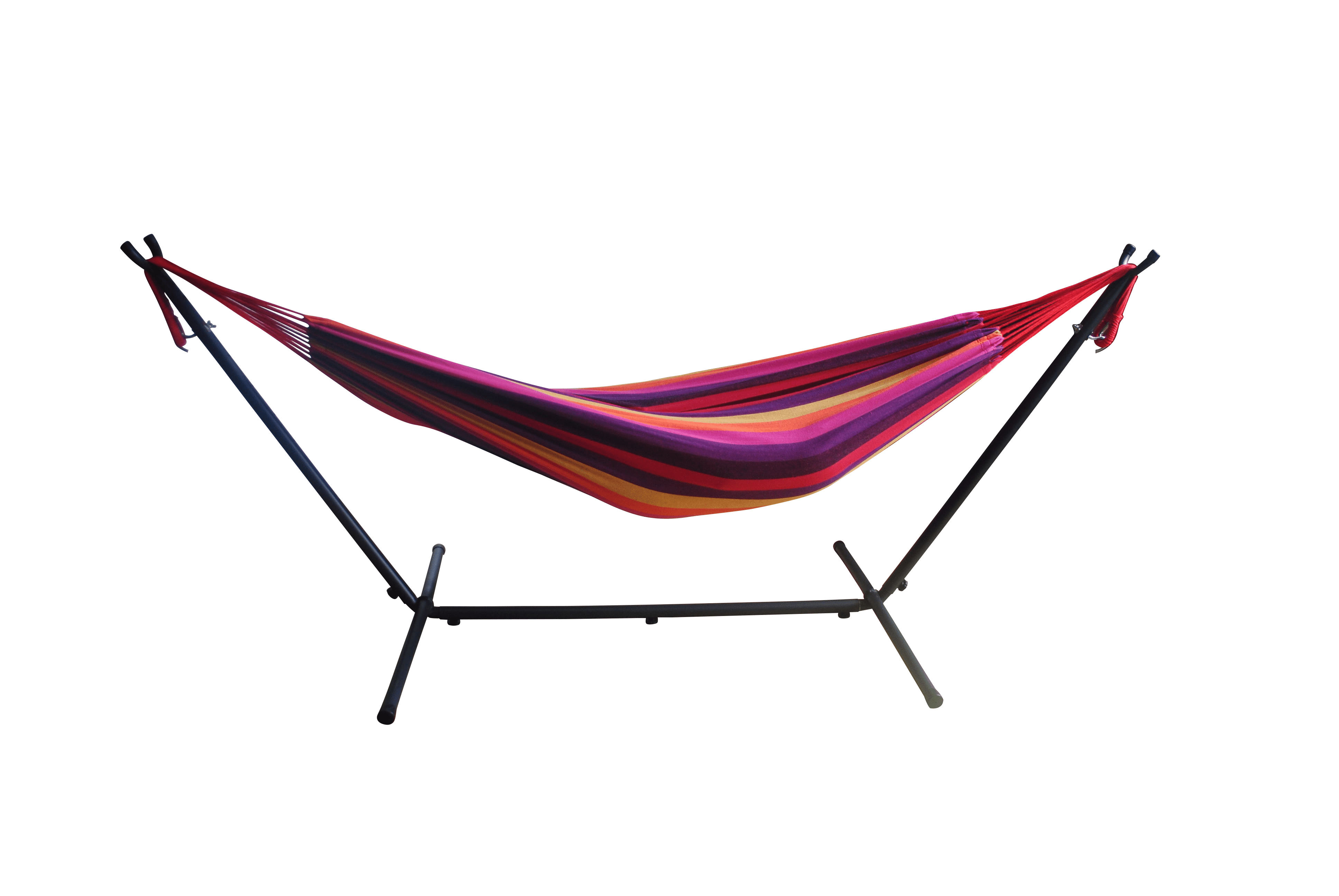 Sturdy polyester and cotton fabric used in the constructions Comfortable hammock is perfect for outdoor relaxation and fun Durable frame It has adjustable height options Portable & easy to store carrying bags INCLUDED Steel stand included Easy assemble Supports 2 adults and holds up to 450Lbs One year limited warranty Imported